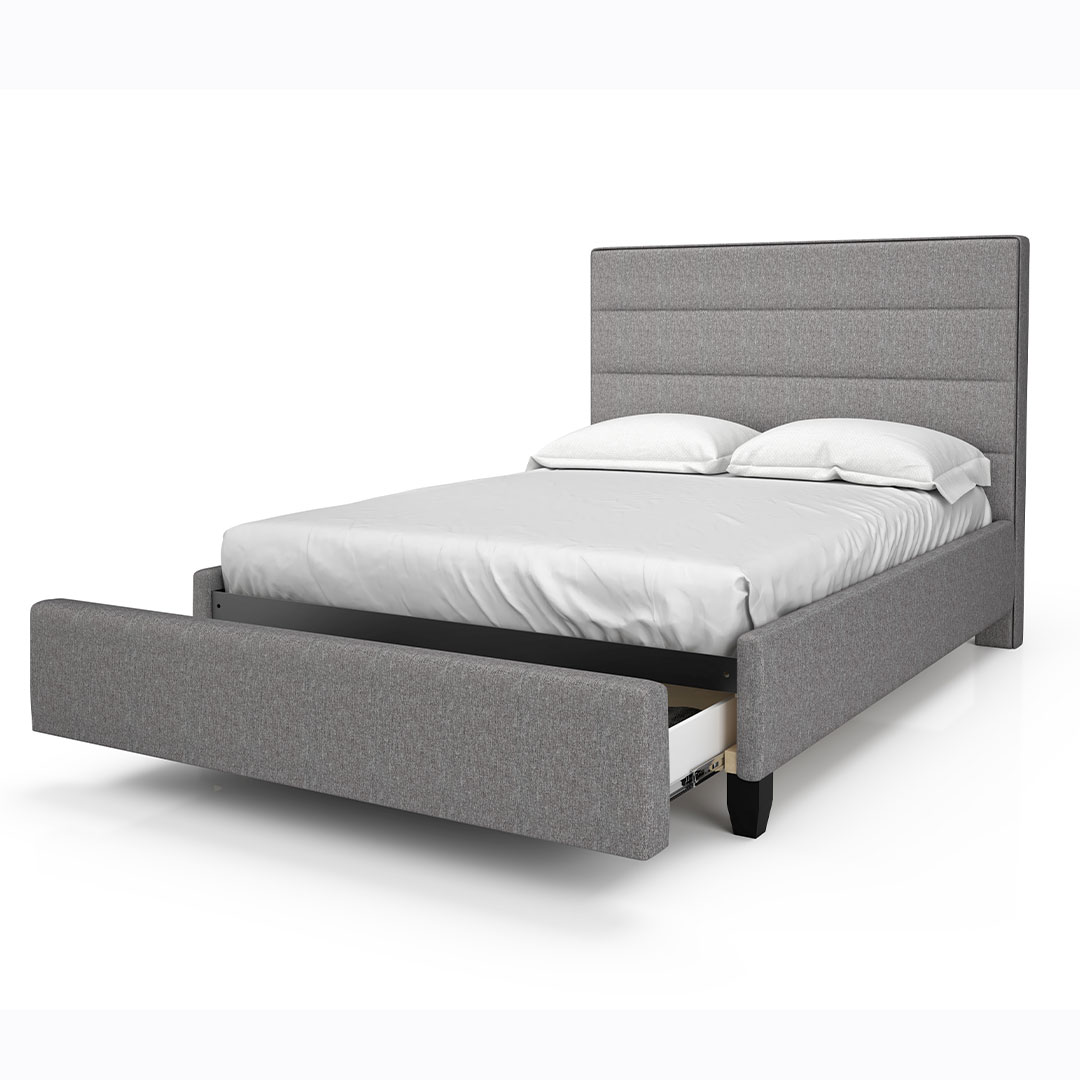 Custom made in Canada with premium fabrics, the upholstered Adelaide platform includes the headboard, side panels, a low footboard and line-tufted accents. The bed comes with a sturdy support deck. Choose from 7 different fabrics! Box spring not required. *mattress not included