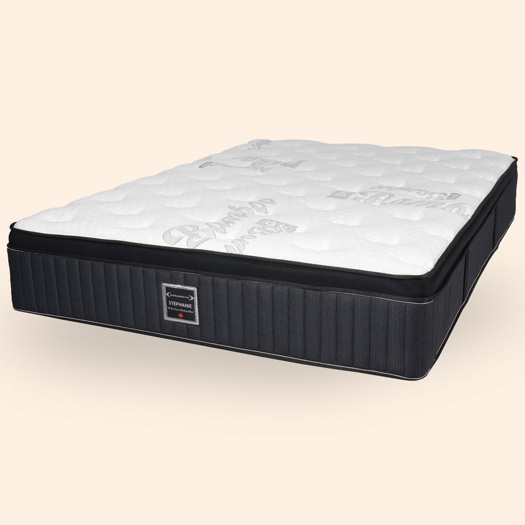 The Stephanie mattress offers a medium-firm pillow top combined with individually wrapped pocket coils for a great nights sleep. The lumbar support keeps the body level for less tossing and turning. Enjoy a temperature regulated sleep with cool fiber fill and bio foams.