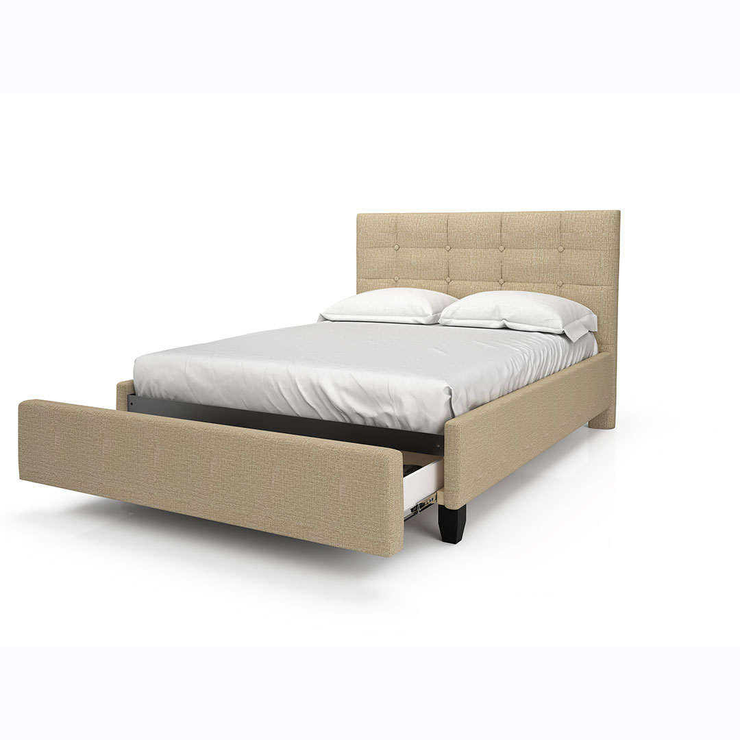 The heaven platform bed is custom made right here in Canada with your choice of fabric. The upholstered bed includes a tufted headboard, side panels, a low footboard and a sturdy support deck. Box spring not required. *mattress not included