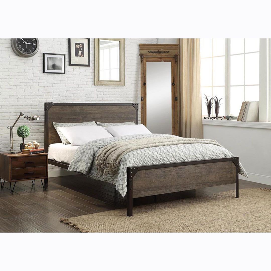 This industrial-style platform bed features wood-like paneling on both the headboard and footboard. No box spring or foundation required. Headboard, footboard, support slats and 5 support bars included. Easy to assemble, a great addition to any room.